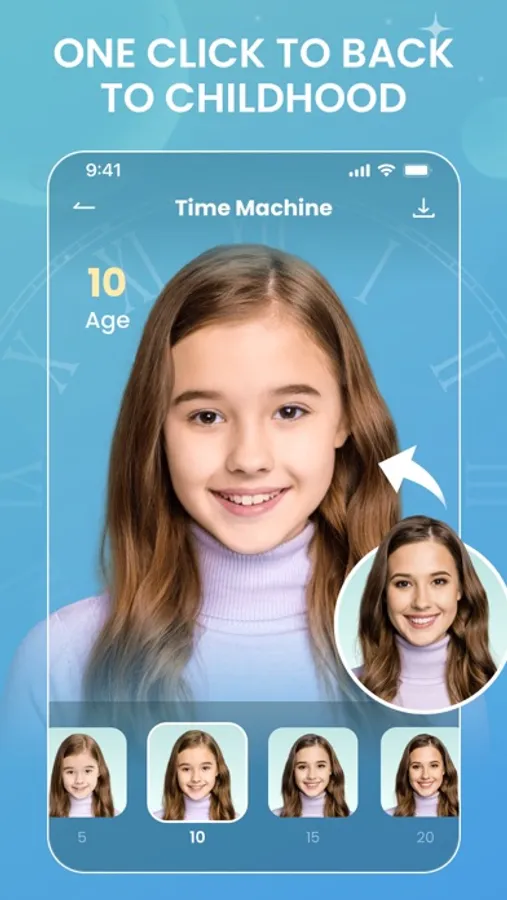 Turn back the clock and revisit your past with our special effects. Relive the appearance of your childhood and the vibrancy of your youth. With just one photo, you can travel back in time to when you were 5, 10, or 15 years old. Take a trip down memory lane and rediscover the joys of childhood with just one click.