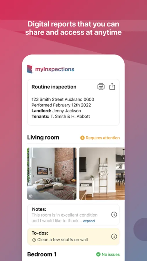 Customise rooms, upload photos and videos, add comments and notes, create to-do lists, and e-sign reports on your device. myInspections ensures any issues are well-documented and inspection reports are thoroughly completed and signed off.