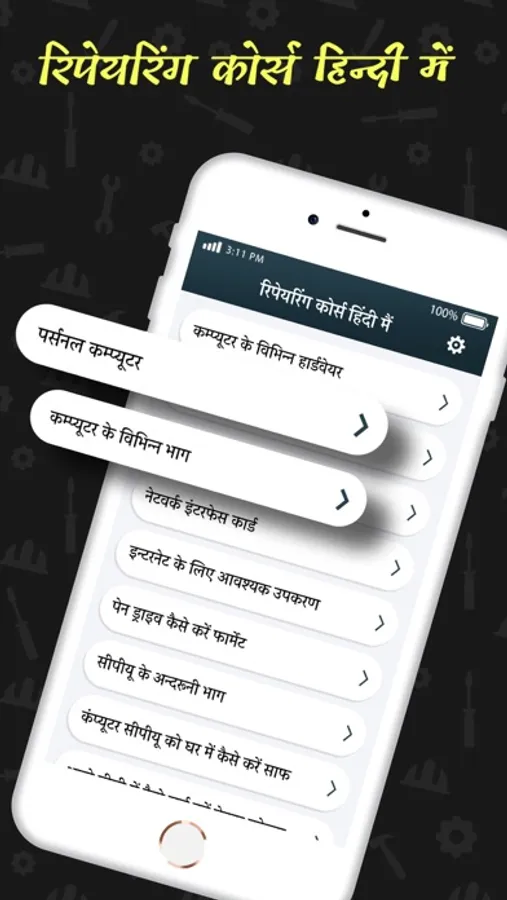 इस ऐप में मोबाइल फोन रिपेयरिंग टूल्स, मोबाइल फोन के विभिन्न हिस्सों का अध्ययन शामिल है।