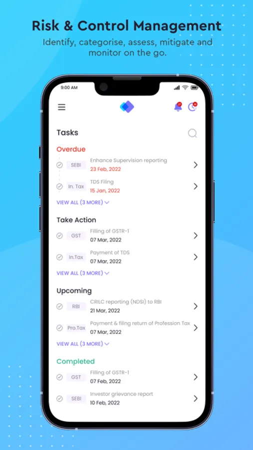 3. Compliance: On time every time. Manage all compliances with dashboards and calendars, review and maker checker system.