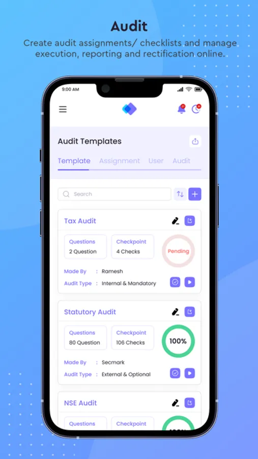 4. Audit: Manage audit lifecycle of creating audit assignments, questionnaires, checklists, audit guidelines, execution, reporting and rectification online.