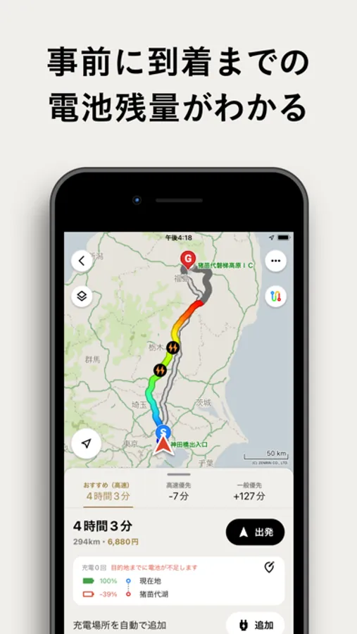 ルート検索では、バッテリーがどこまで持つのか分かりやすく表示され、電池残量が少なくなる付近の充電スタンドを提案します。
