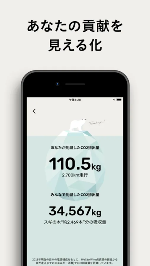 EVでの走行に係るCO2排出量をWtW(Well To Wheel)で計算し、ガソリン車と比較した際のCO2削減量を走行距離とともに記録します!