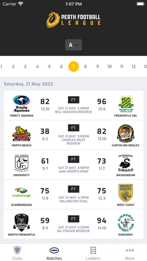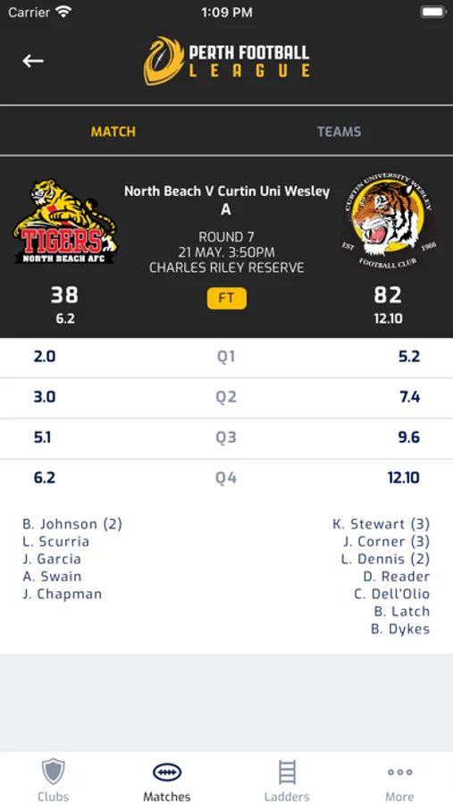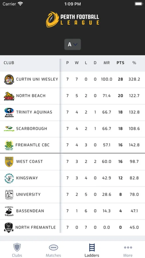 Keep up to date with the latest scores, ladders, fixtures, results and team lineups from across the Perth Football League.