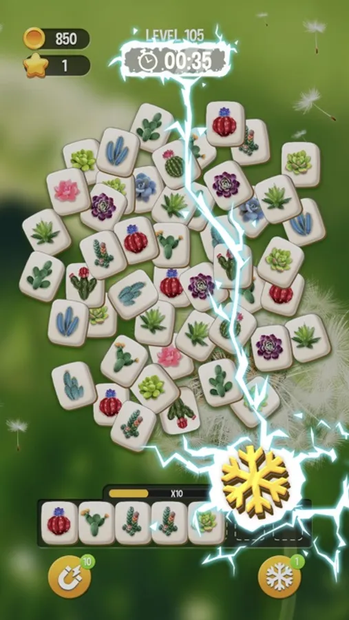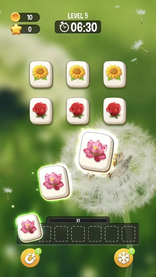 Match 3 same flower tiles to clear them and score. Match as fast as possible to score more starts. Match all the tiles in the limited time the pass levels. Don't forget to use boosters to pass levels easier.