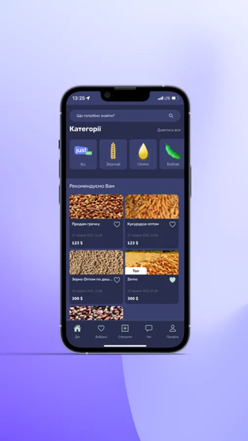 Купи різні сільгосппродукти прямо в додатку: молоко, яйця, м'ясо, пшеницю, ріпак, овес, гречку, ячмінь, жито, фуражні трави, соняшник, картопля, капусту, кукурудзу, морква, цибуля, буряки, часник, груші, виноград, полуницю, малину, добрива, пестициди, обладнання, спецтехніку та інші товари.