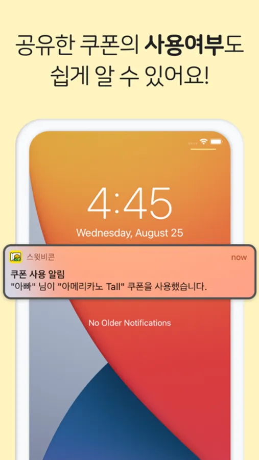 스위티콘을 이용해서 원하는사람과 기프티콘을 공유할 수 있습니다. 상대방이 기프티콘을 사용하면 나에게도 알림이 와 사용여부를 바로 알 수 있습니다!