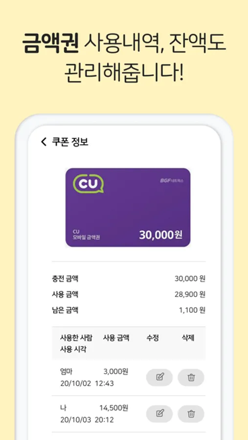 금액권(1만원권, 3만원권 등)의 사용내역을 관리해 사용금액과 잔액을 알 수 있습니다.