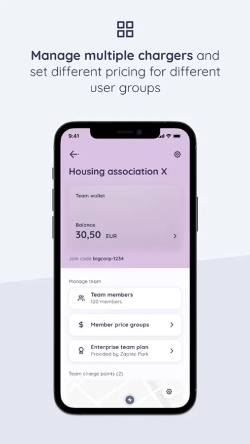 Manage multiple chargers - Setup a team for your company or association and use Zaptec Park to manage your chargers and receive payments from members or public users. Set one price for members and another for public users.