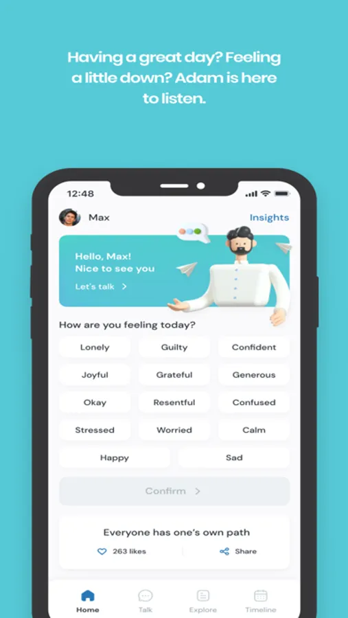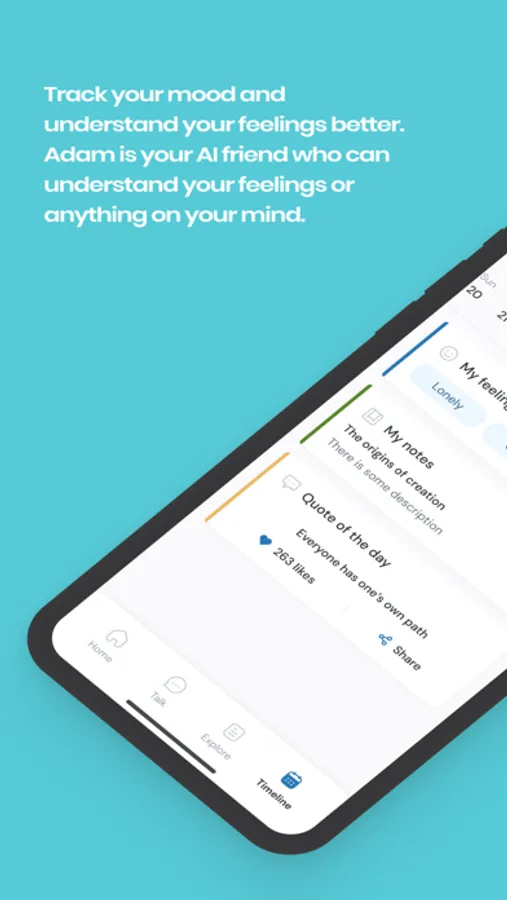 Track your mood. Interact with Adam and create meaningful conversation. Walk together as it helps you understand your thoughts and feelings, track your mood, guide you with your journey, and improve your well-being.