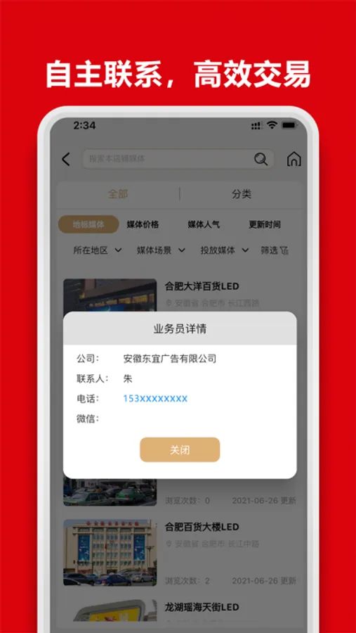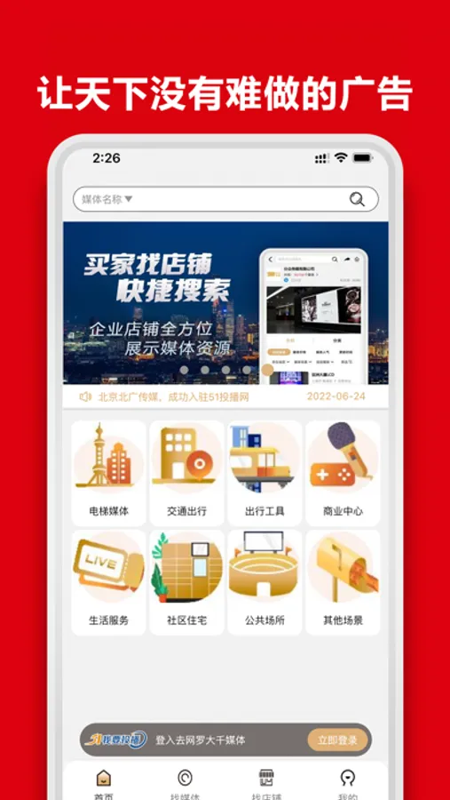 【找媒体】投放户外广告,通过地区、场景、媒介,一站查找想要投放资源地址、点位图、详情图、价格、媒体价值、案例、收藏等,查看媒体联系方式,高效沟通方案及折扣价格,匹配对的资源。