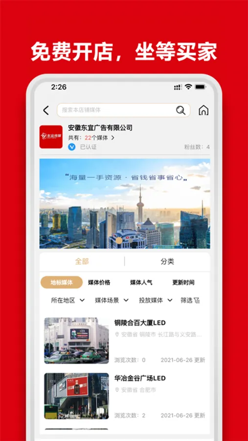 【找店铺】全球户外广告媒体资源一键查询,店铺资源展示,直线对接海量买家,解决三四线城市业务对接,企业店铺,快捷找店铺,查看投放地区所有店铺,所有场景点位,同行采买,海量曝光,自主查看卖家联系方式,被同行采买,媒体比价交易,买到满意的产品和服务。