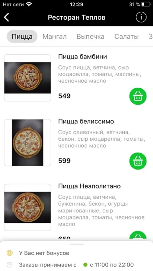 Доставка еды из ресторана "Теплов". 25 видов пицц, блюда на мангале, закуски и салаты