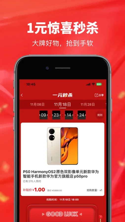 - 全年365场真实秒杀活动,不用拼单,不用拉人头,不用砍价。爆款商品秒不停,大牌手机0元抢,每日整点限时疯抢。