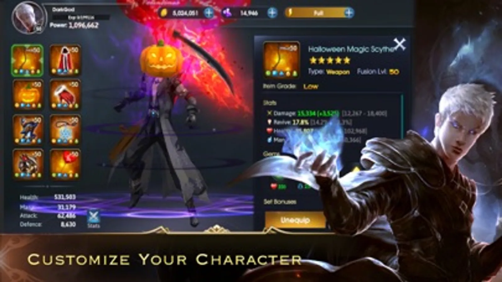 Fill your inventory with weapons, armors, wings, and lots of different loot from your battlefields. Enhance your equipment by fusing it with a vast variety of mystical ingredients. Collect enchanted king feathers, scrolls, and other mighty gems. Create immortal weapons of war like the Paladin Blade, or Dark Demon Wings.