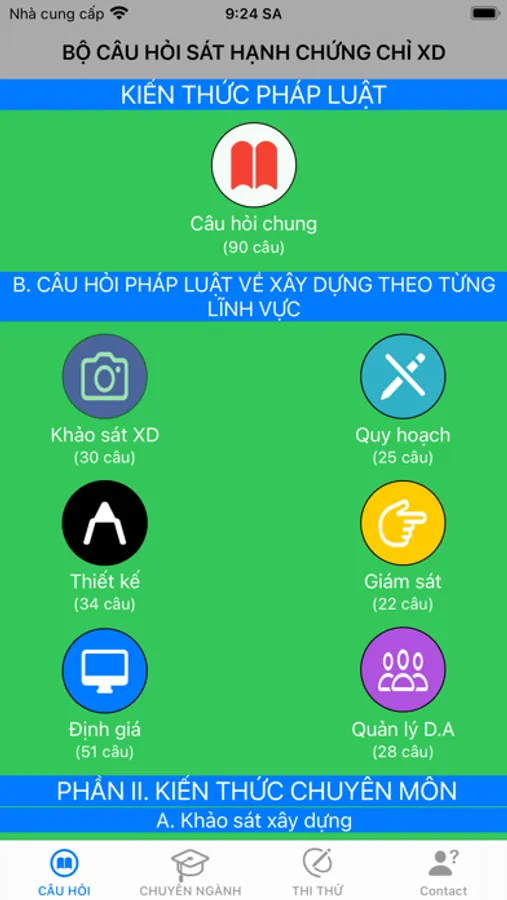 Theo Quyết định số 702/QĐ-BXD ngày 09/06/2021 của Bộ Xây dựng về việc công bố điều chỉnh Bộ câu hỏi phục vụ sát hạch cấp chứng chỉ hành nghề hoạt động xây dựng. Phần mềm bao gồm: