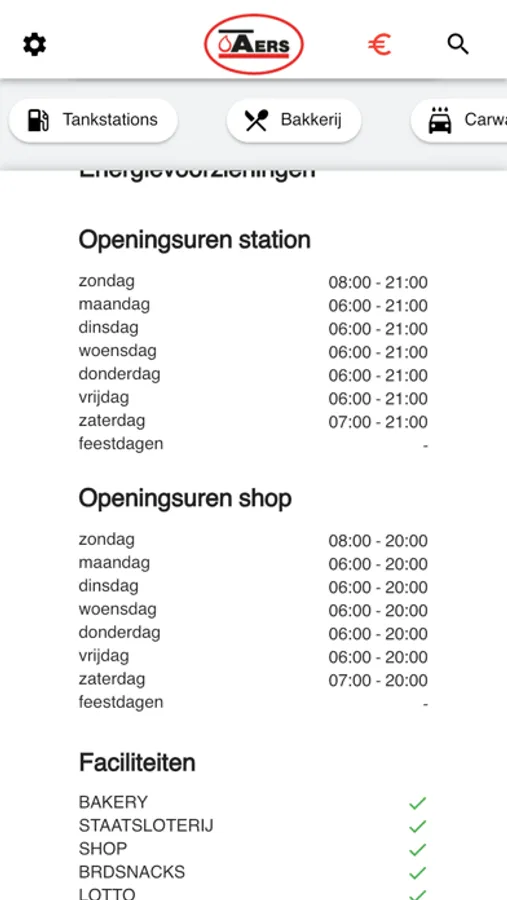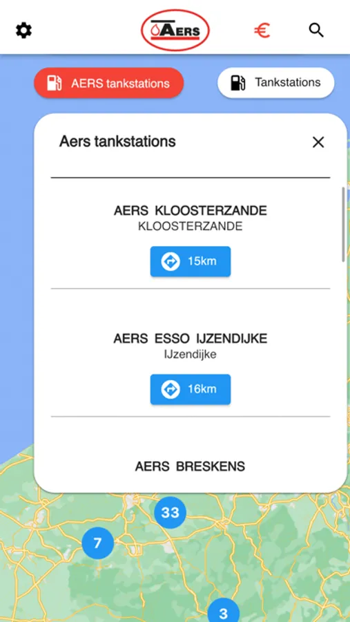 Aan de hand van de Aers tankapplicatie kunt u snel en eenvoudig de dichts bijzijnde Aers tankstations vinden. Zoekt u een tankstation waar een carwash, truckwash, bakkerij bijzit? Dan kunt u ook deze snel en eenvoudig vinden. Aan de hand van de filter die u terugvind op de instellingen pagina kunt u zelf instellen hoever het tankstation van uw locatie verwijderd is en/of welke brandstof u naar op zoek bent. Op de kaart kunt u dan rondkijken naar de tankstations. Wanneer u op een tankstation klikt ziet u verdere informatie over het tankstation en kunt u met 1 klik op de knop naar het tankstation navigeren. Ook kunt u de huidige adviesprijzen van de brandstoffen terugvinden op de app.