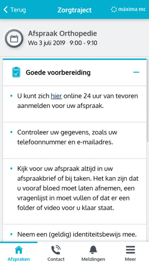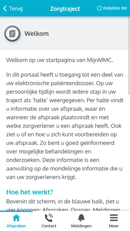 Mijn MMC is een gratis applicatie voor telefoon, tablet en desktop en is altijd en overal beschikbaar. Mijn MMC biedt u op een efficiënte wijze, alle informatie over uw behandeling en persoonlijke zorgtraject. Voor, tijdens en na de behandeling ontvangt u specifieke, relevante informatie in korte berichten en herinneringen in uw persoonlijke tijdlijn. Met de gebruikersvriendelijke app Mijn MMC bent u optimaal voorbereid op de behandeling en uw herstel.