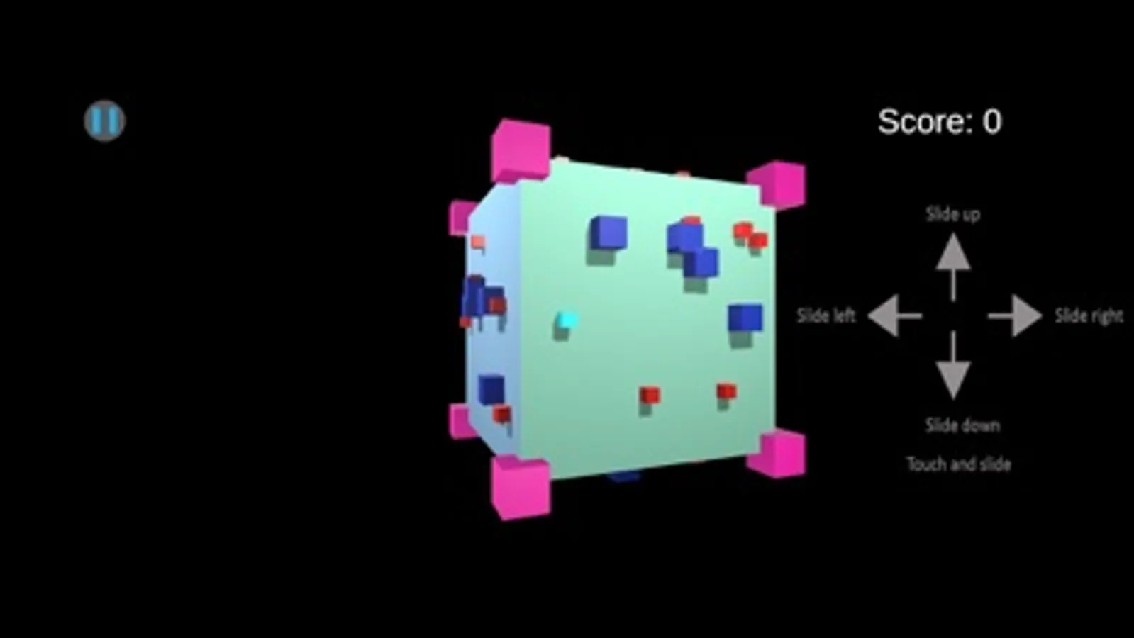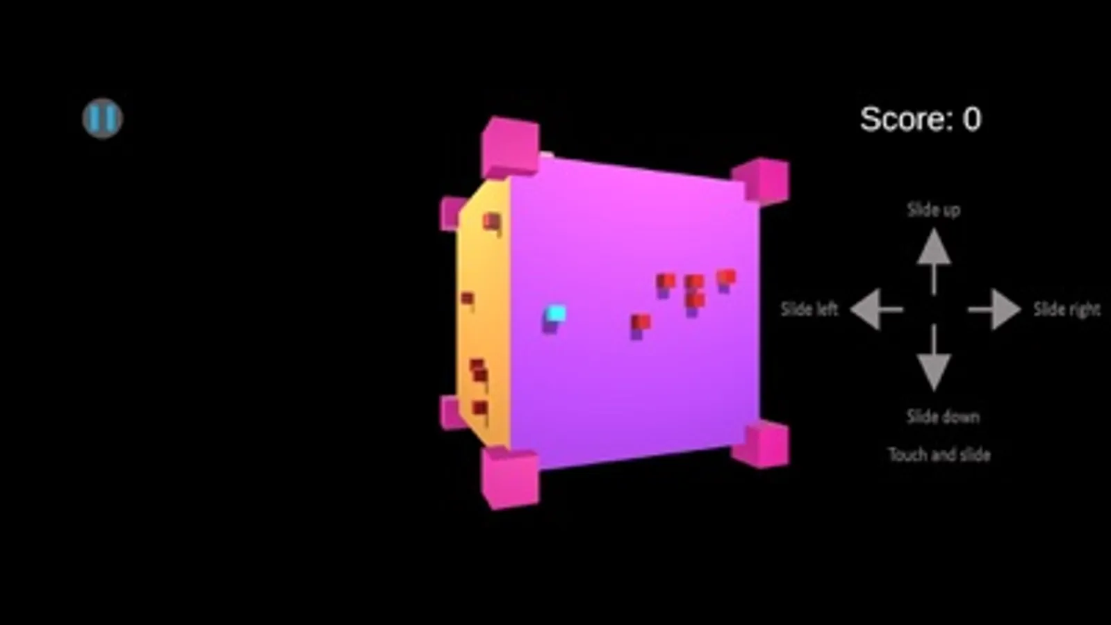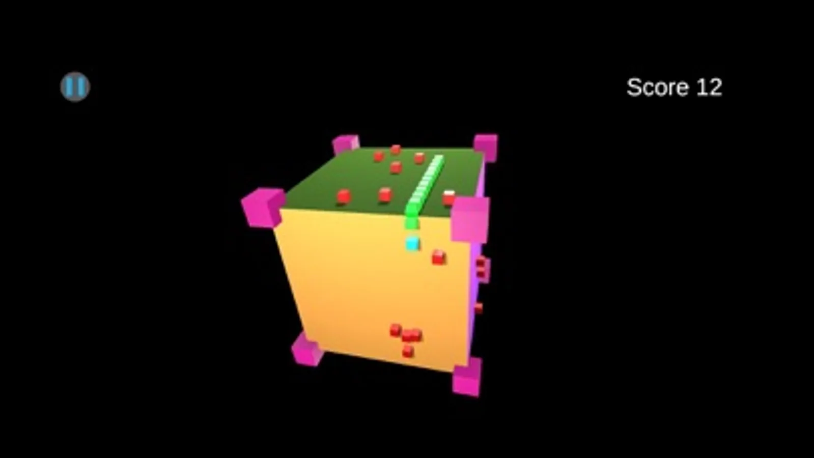 This is a 3D version of the snake game where the snake moves on the 3D cube surfaces eating its prey without hitting the obstacles or itself. With each eat, the snake grows.