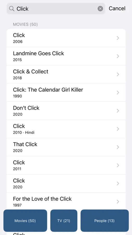 • You can search movies, tv and people. The sarch results will be shown as three seperate category. You can navigate whichever category you want by the three buttons at the bottom of the search screen.