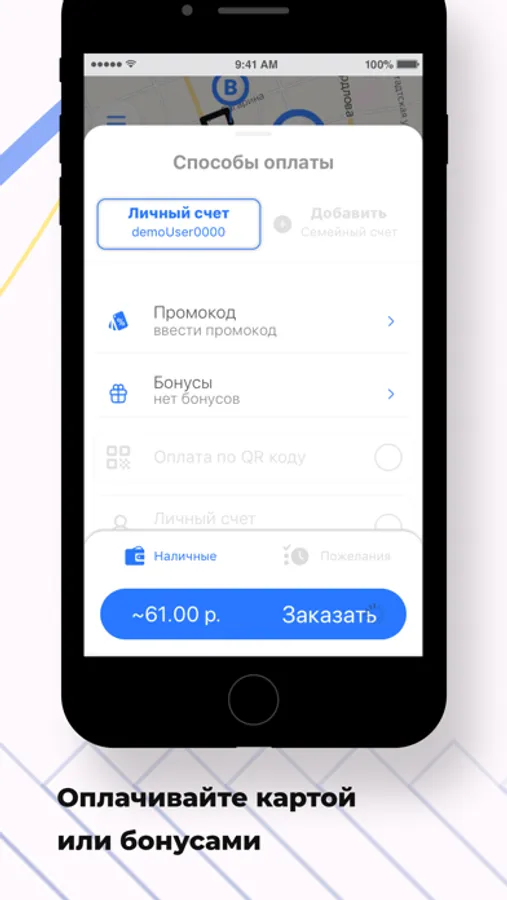 Оплачивайте поездки наличными, картой или накопленными бонусами. Также вы можете оплатить поездку через любое банковское приложение по QR-коду.