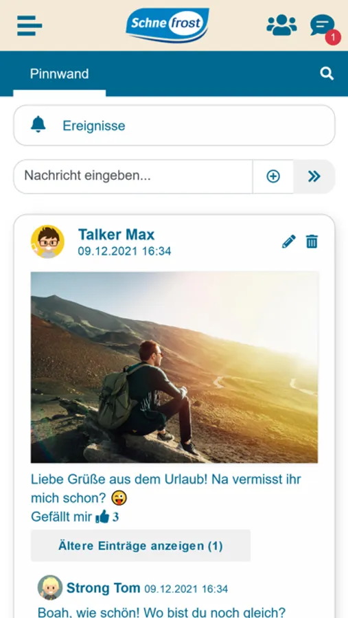 Mit der Schne-frost-Team-App sind Sie stets über die attraktiven Mitarbeiter-Angebote und über alle wichtigen Neuigkeiten aus dem Hause Schne-frost informiert. Mittels internem Messenger haben Sie die Möglichkeit, direkt mit Ihren Kolleginnen und Kollegen zu chatten oder persönliche Erlebnisse und Ideen auf die Pinnwand zu posten. Die App ähnelt dem Aussehen einer gewohnten Social-Media-Umgebung und ist daher überaus einfach zu bedienen.
