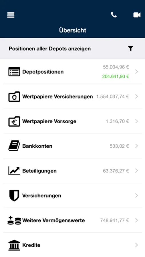 - Konsolidierte Vermögensübersicht inkl. aller Fondsanteile, Versicherungen, Beteiligungen und Bankkonten