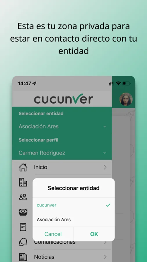 cucunver es una aplicación desde la que podrás acceder a la zona privada que te conecta con tu asociación. Desde ella podrás consultar y compartir documentación con tu entidad, solicitar cambios en tu información personal, consultar las cuotas de las que formas parte y el estado de las mismas, añadir el método de pago que deseas utilizar para hacer frente al pago de las cuotas, consultar y subscribirte de forma online a las actividades organizadas por tu asociación, recibir y enviar comunicaciones y estar al tanto de las noticias que sean de interés para los usuarios de la entidad.