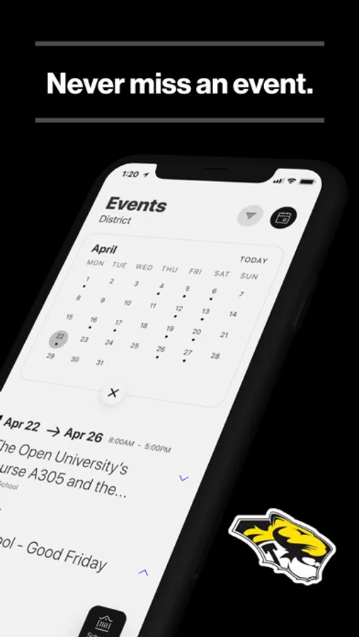 The event section shows a list of events throughout the district. Users can add an event to their calendar to share the event with friends and family with one tap.