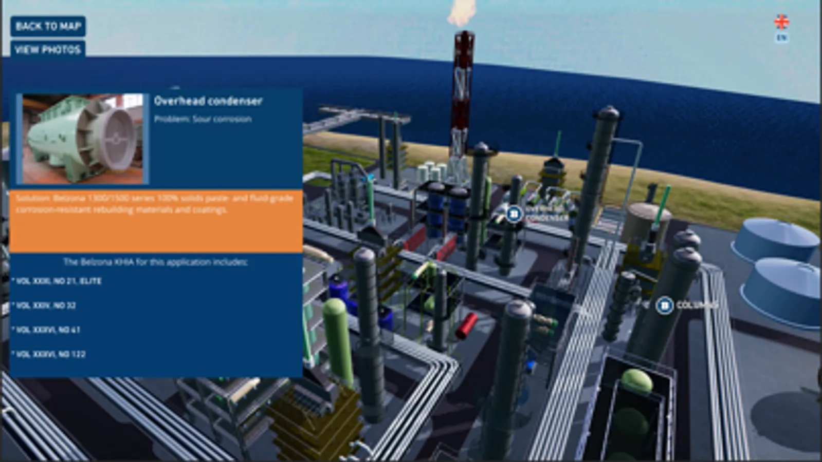 Belzona Solutions Map for the oil refinery industry is an interactive 3D map showing different sections of the refinery machinery and equipment. The map serves as a tool that helps identify where repair and maintenance problems can occur and what solutions Belzona offers. Additionally, the map provides references to relevant case studies, includes photos and videos.