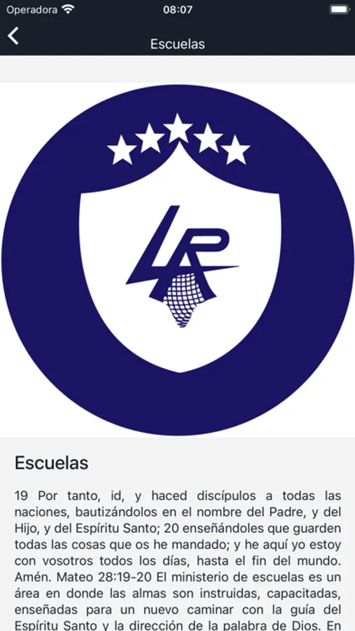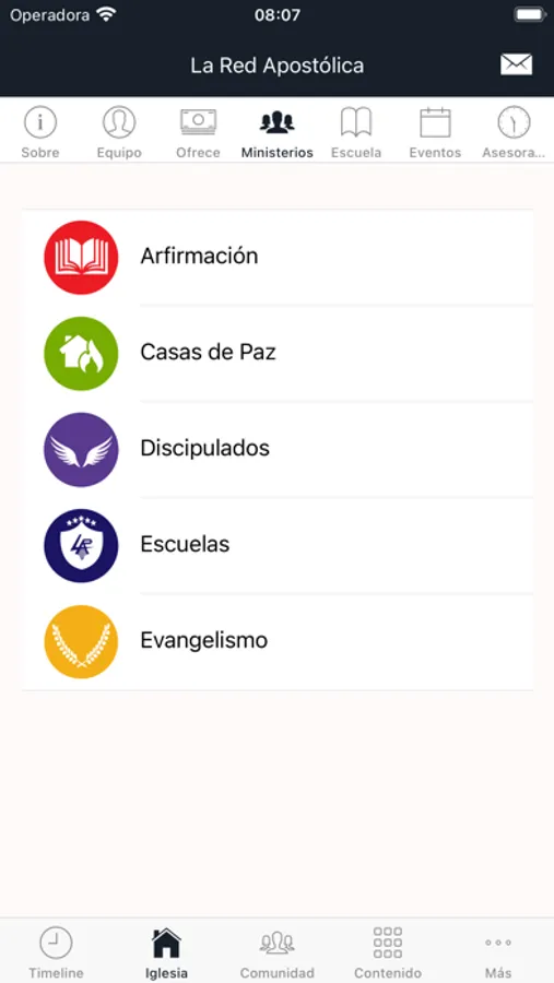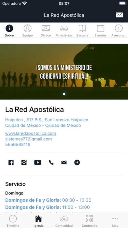 - Información de la iglesia (dirección, teléfono, sitio web, redes sociales, pastores)