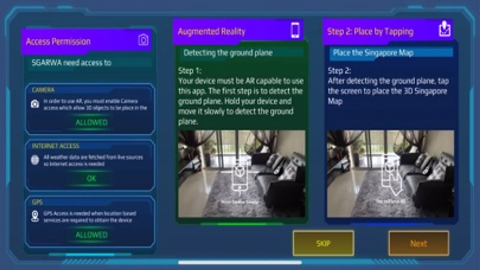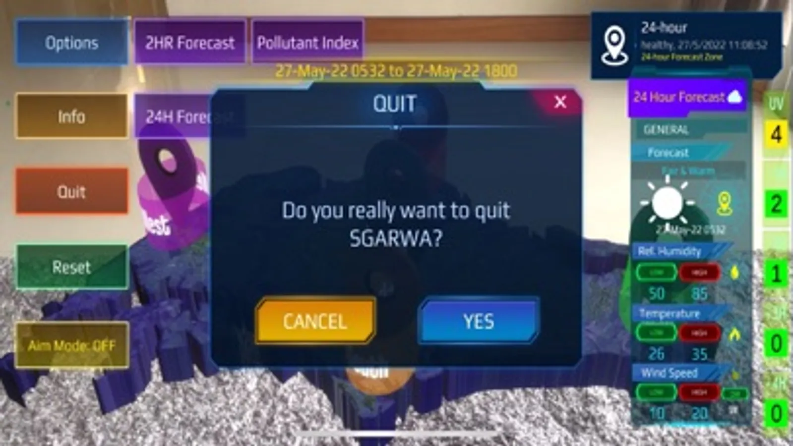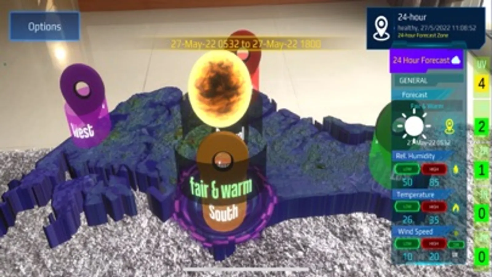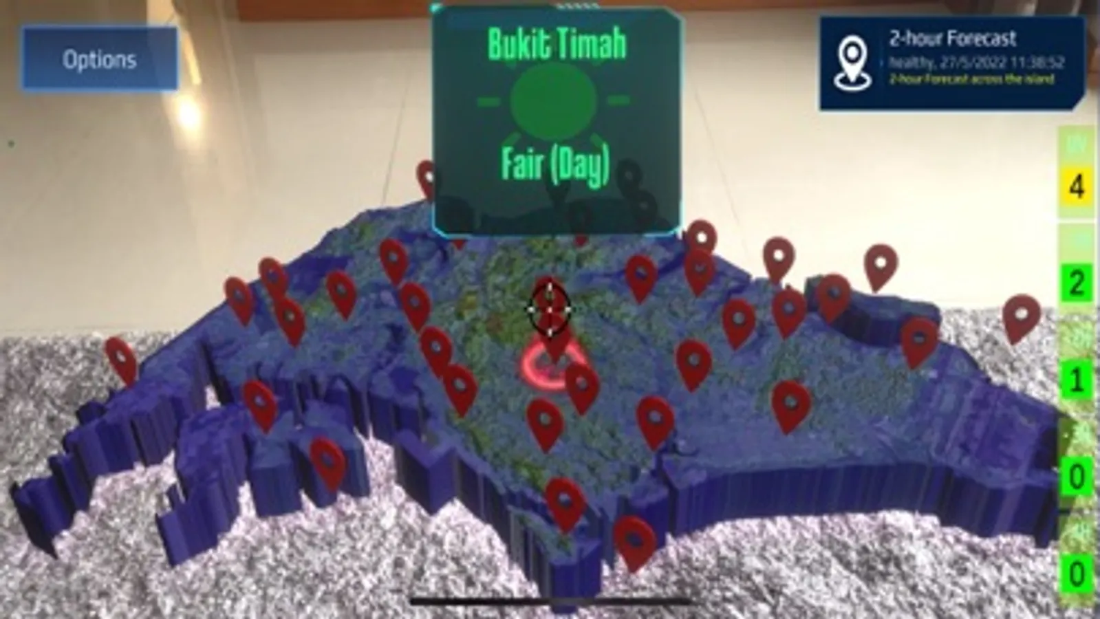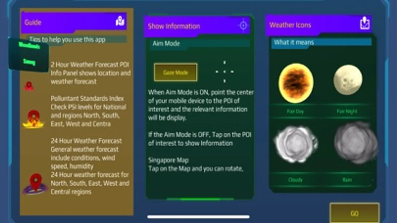 Introducing SGARWA: A beautiful and accurate Weather app that also shows you Weather conditions around you in Augmented Reality. Simply hold your Device up in the direction of the Singapore Map, to see what Weather conditions are like in that area! In addition to Augmented Reality feature, SGARWA includes full Local Weather Forecast and Pollutant Indexes as well. Local Weather includes Current 2H Weather, a 24H Forecast, Ultra Violet Index, Pollutant Standards Index.