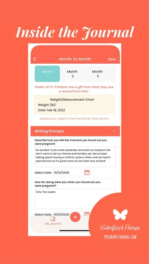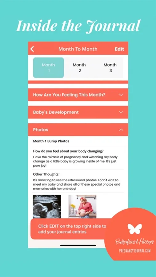 Butterflies & Hiccups Pregnancy Journal is the #1 interactive pregnancy journal app for expecting moms. Easily build your own pregnancy story and keep track of the important moments during this miraculous journey!