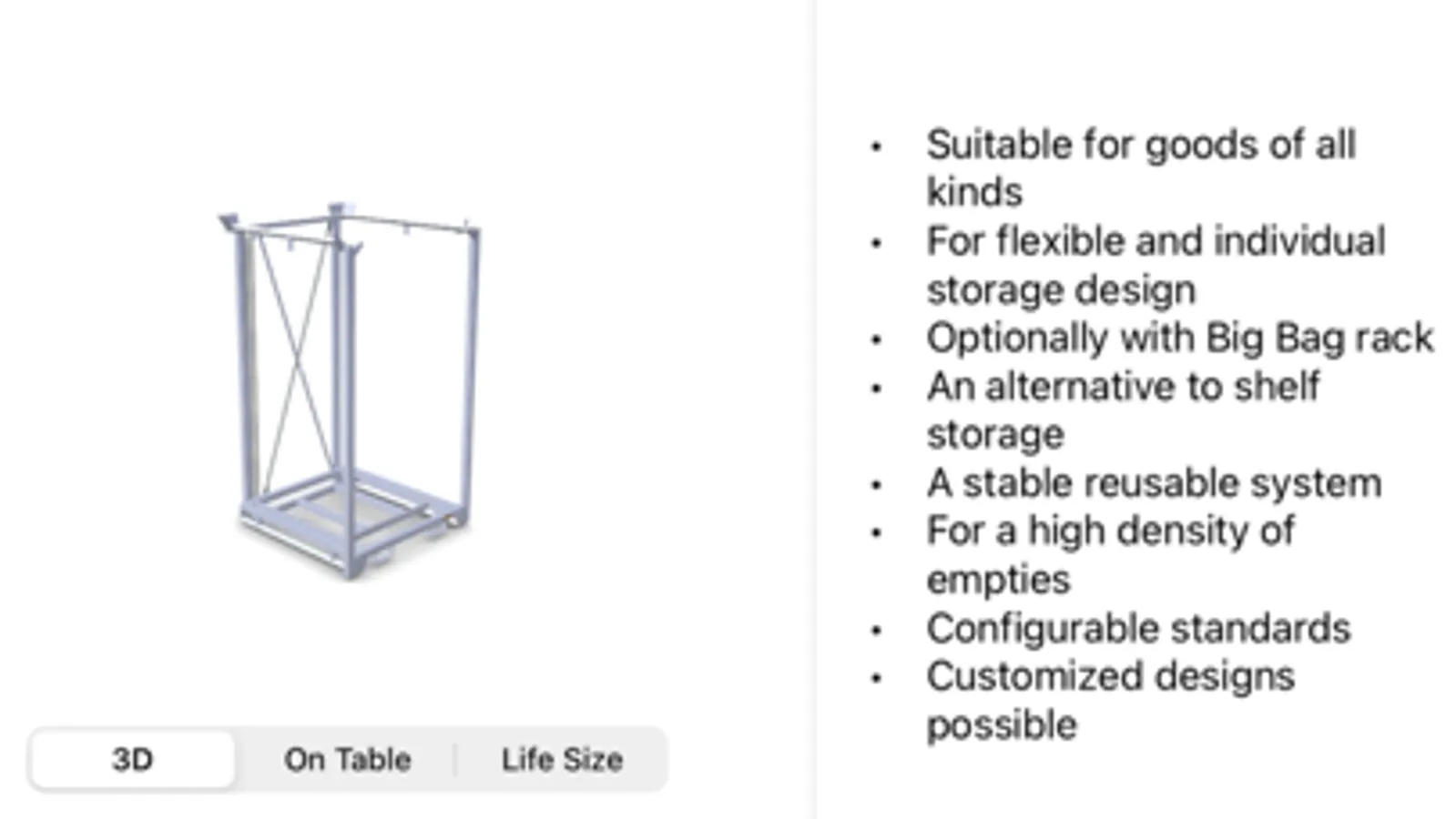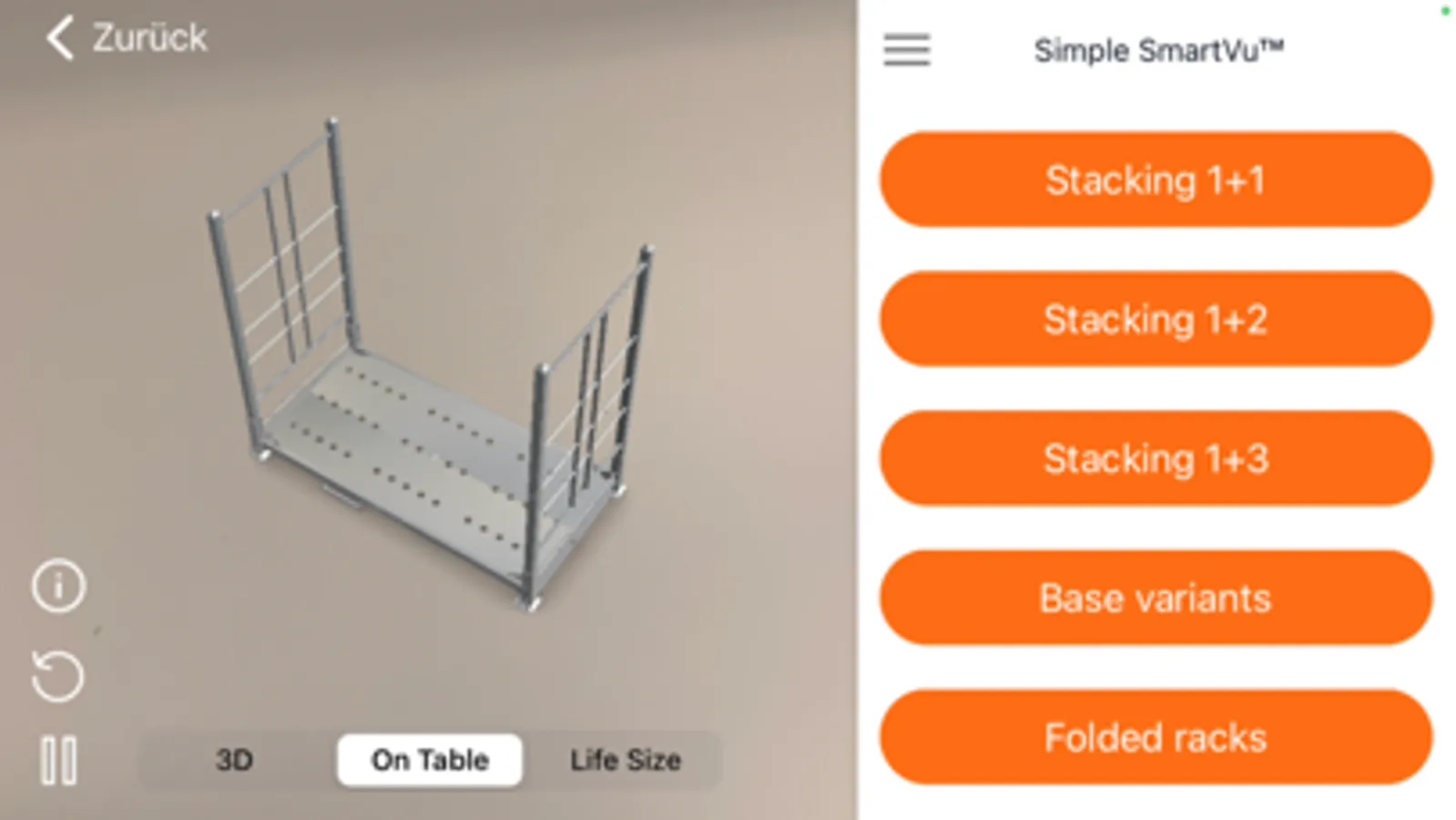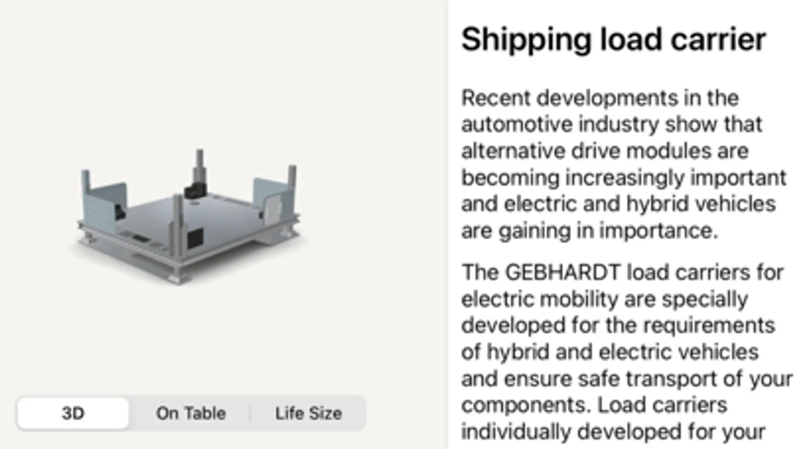With this app you can digitally experience GEBHARDT products in AR on your smartphone or tablet. Expand your knowledge of product features and possible uses in a playful way. In the side bar you will find product specifications and details about our load carriers. In addition, this app offers you the possibility to project our containers in AR in life size or on table in your premises.