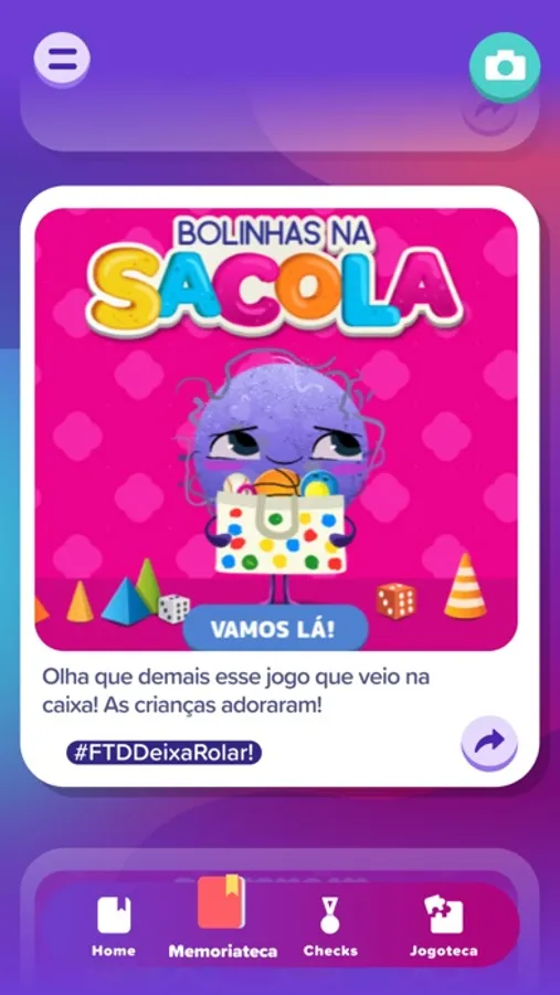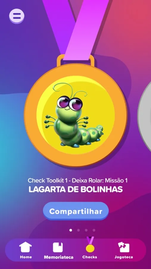 O aplicativo é o suporte para a execução das MISSÕES dos toolkits e também possui algumas atividades extras como a MEMORIATECA e a JOGOTECA, além de permitir que a criança receba conquistas digitais, os CHECKS!