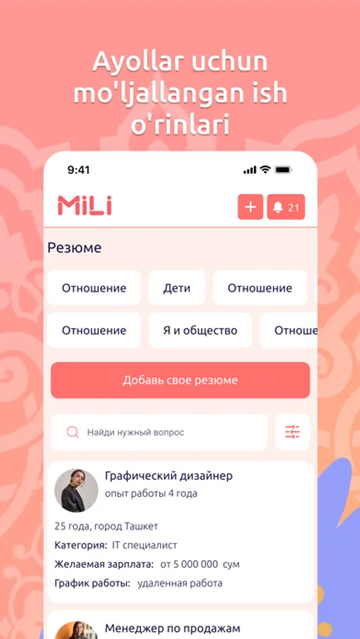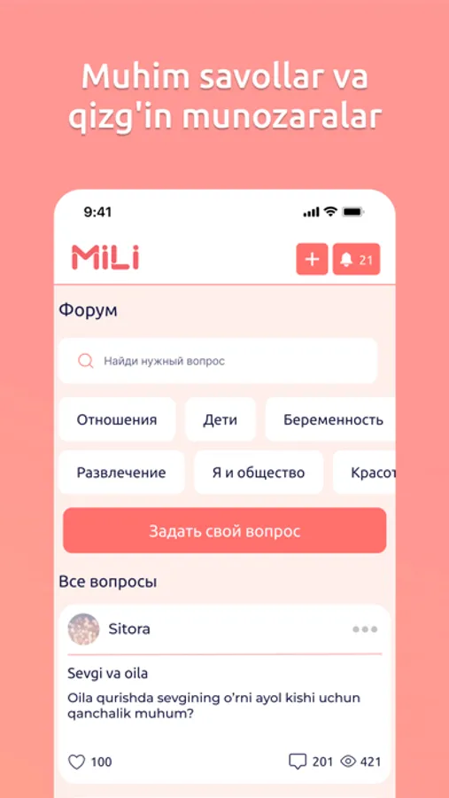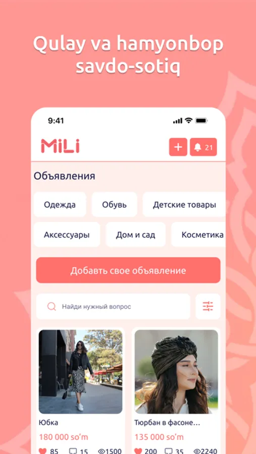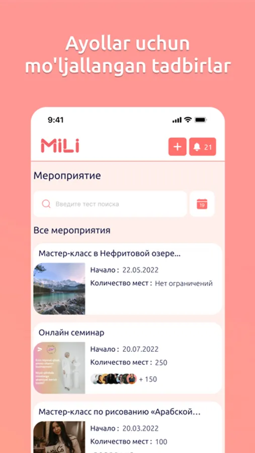 Mili.uz - bu faqat ayollar uchun mo'ljallangan birinchi ijtimoiy tarmoq bo'lib, ushbu tarmoqda siz yangi do'stlar, bilim va amaliy ko'nikmalarga ega bo’lishingiz mumkin. Qolaversa, ayollar uchun mo'ljallangan tadbirlarda hayotingizni yanada faollashtirishingiz, savdo qilishingiz, ish topishingiz, kundalik hayotda paydo bo'ladigan masalalaringizni hal qilishingiz, hamda o'z qiziqishingizga ko'ra, blogerlik sohasida ish yuritishingiz ham mumkun. - buni hammasi Mili loyihasida mujassam.