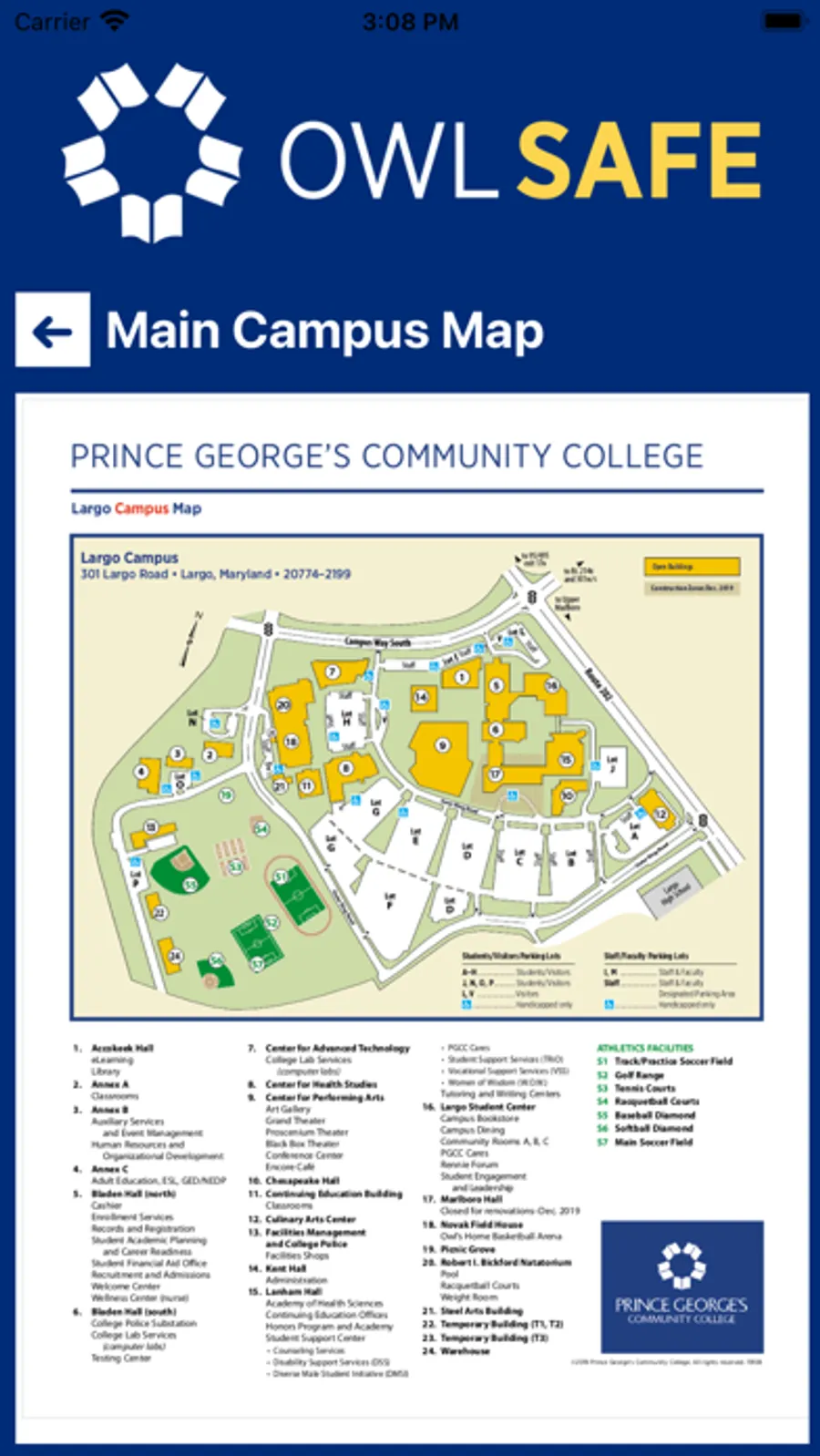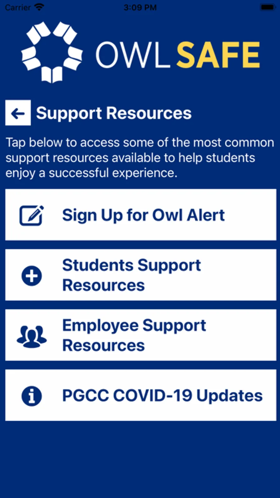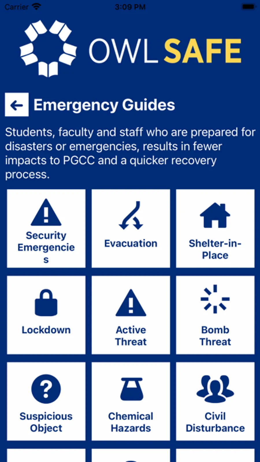 Owl Safe is the official safety app of Prince George's Community College. It is the only app that integrates with Prince George's Community College's safety and security systems. PGCC has worked to develop a unique app that provides students, faculty and staff with added safety on the Prince George's Community College campus. The app will send you important safety alerts and provide instant access to campus safety resources.