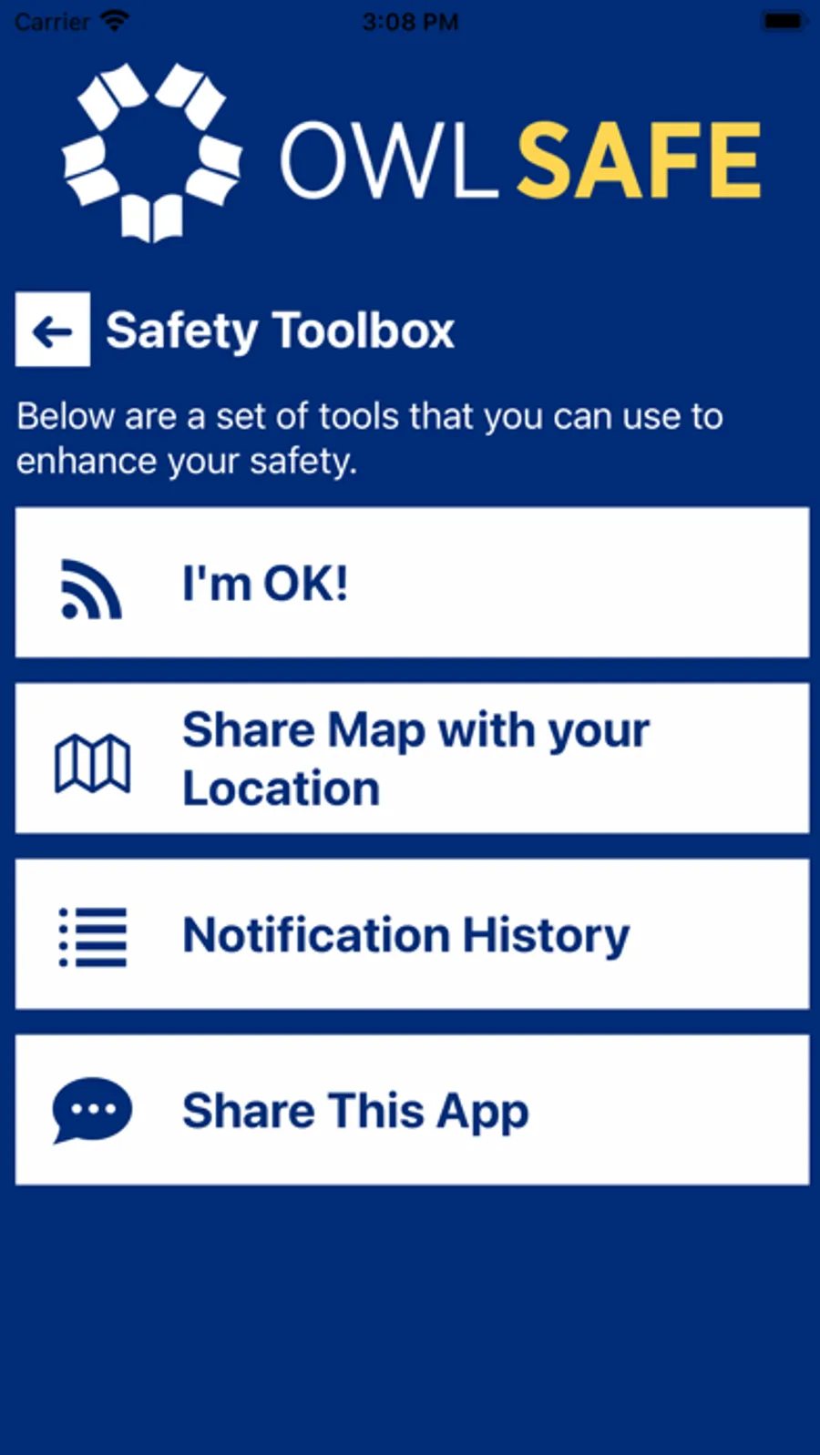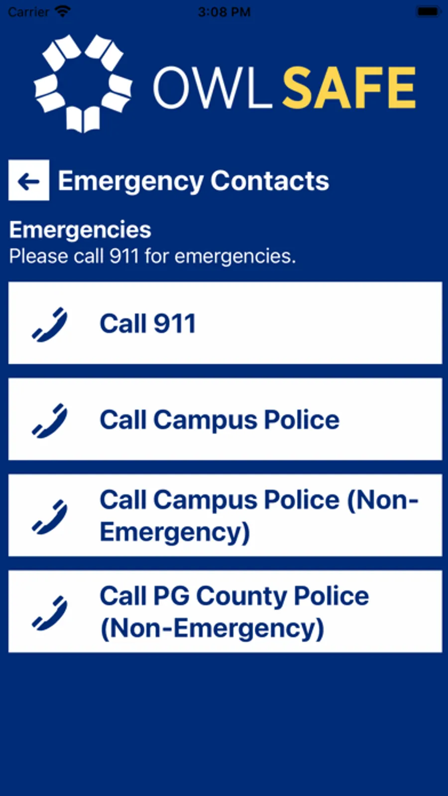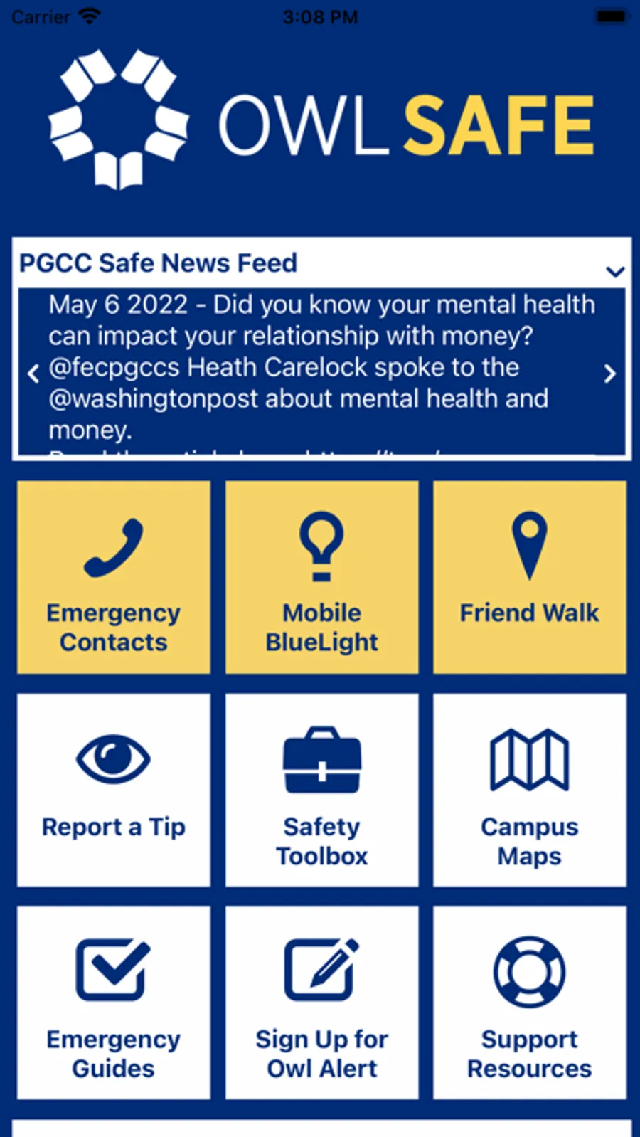Owl Safe is the official safety app of Prince George's Community College. It is the only app that integrates with Prince George's Community College's safety and security systems. PGCC has worked to develop a unique app that provides students, faculty and staff with added safety on the Prince George's Community College campus. The app will send you important safety alerts and provide instant access to campus safety resources.