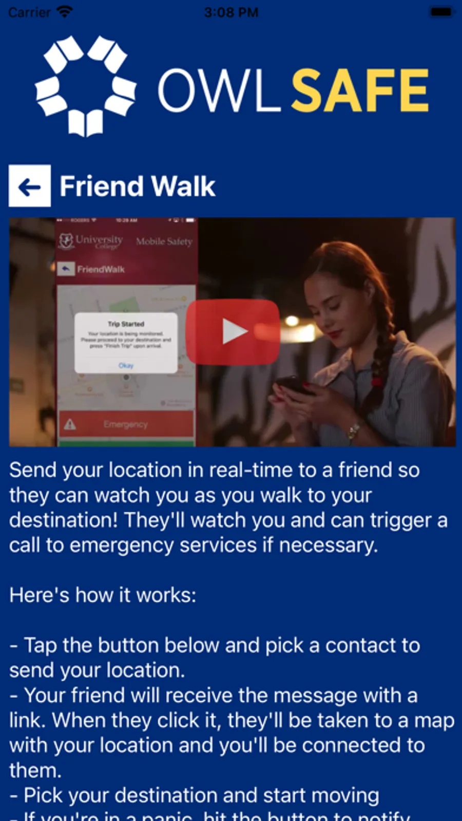 - Friend Walk: Send your location to a friend through email or SMS on your device. Once the friend accepts the Friend Walk request, the user picks their destination and their friend tracks their location in real time; they can keep an eye on them to make sure they make it safely to their destination.