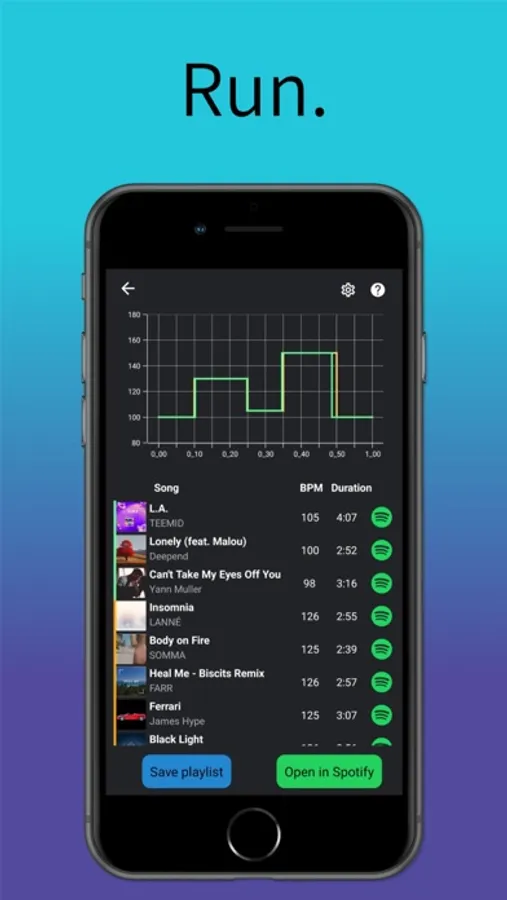 BeatRunner helps you make the perfect running playlist by finding songs based on Spotify recommendations that match your running cadence. Plan out your run with our easy to use graph: start off slow, create intervals, or just set a constant speed. BeatRunner will create a custom playlist to match your running plan and keep you on pace!