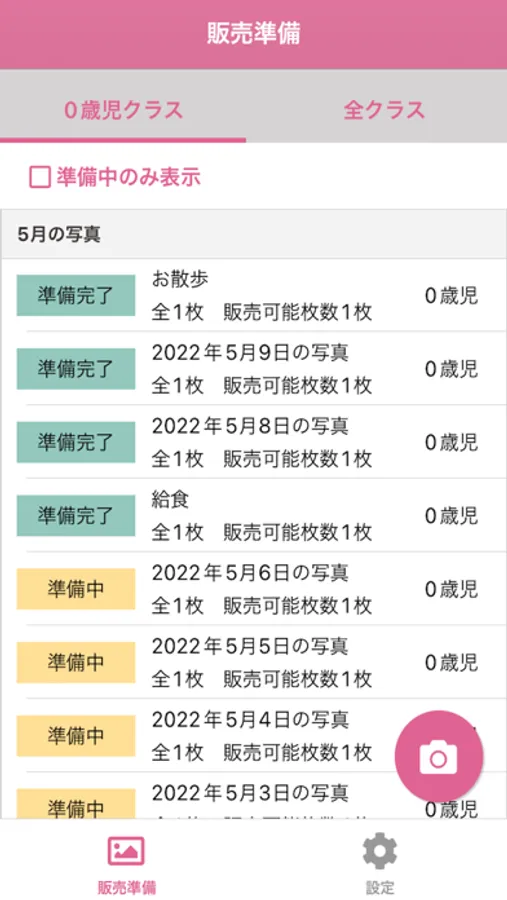 保育園ID、パスワードを入力して、クラスを選択後、販売する写真の整理や、撮影ができます。