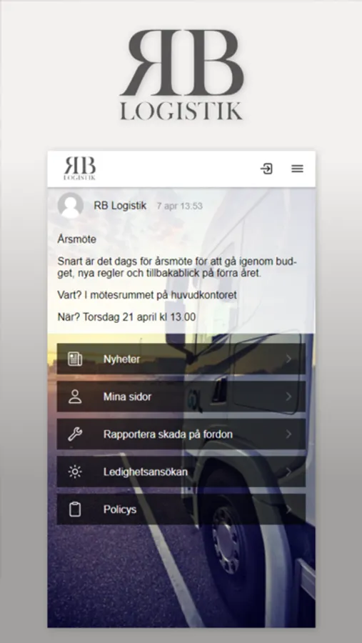 I RB Logistiks app kan du som behörig ta del av en förenklad arbetsdag genom b.la. olika digitala dokument och checklistor. Du kan även ta del av informationsflöde, policydokument, kontaktuppgifter och mycket mer.