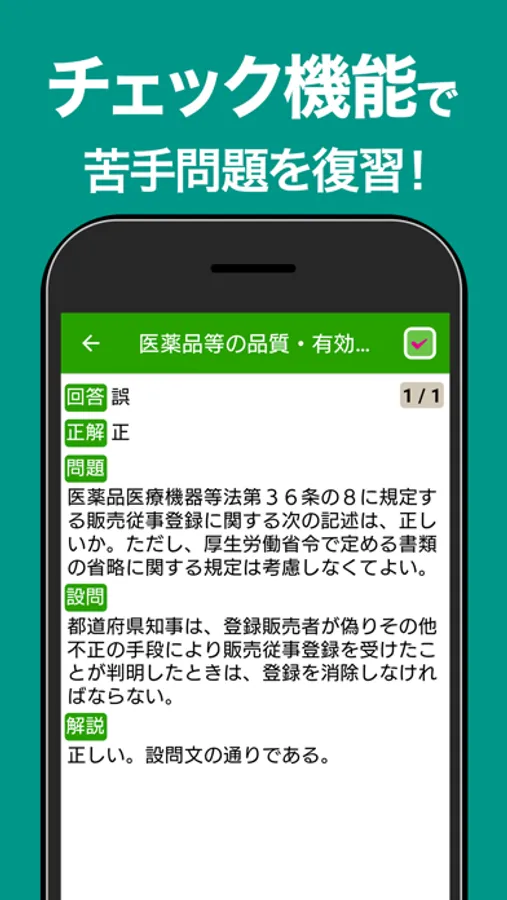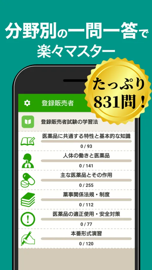 登録販売者、試験対策アプリの決定版!分野別一問一答から本番形式までたっぷり831問題。