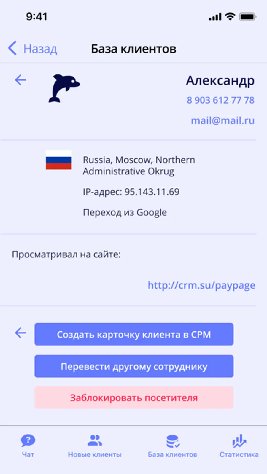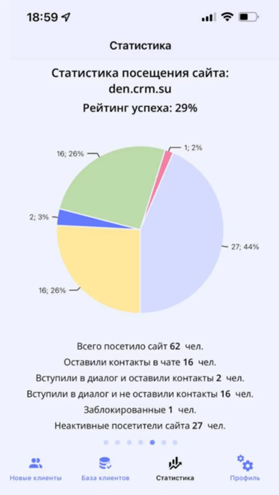 Посетители вашего сайта всегда под рукой 24/7 где бы вы не находились. Данные посетителя сайта, регион, история просмотров и контакты! Удобный переход в СРМ систему для создания карточки клиента. Удобство передачи клиента другому сотруднику. Блокировка нежелательного клиента. Круговая диаграмма наглядно отображает динамику посещения и активность вашего сайта в долях: