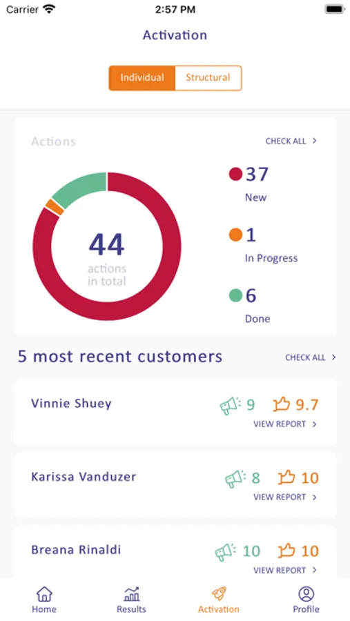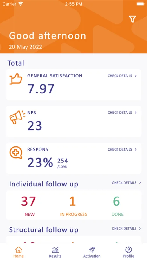 KPI’s such as satisfaction, (e)NPS and response rate can be followed 'on the go' via the Integron Dashboard app. Initiate actions based on the highest priorities with the aid of action management. The Integron Dashboard app is accessible to all users of our online dashboard. The app features: