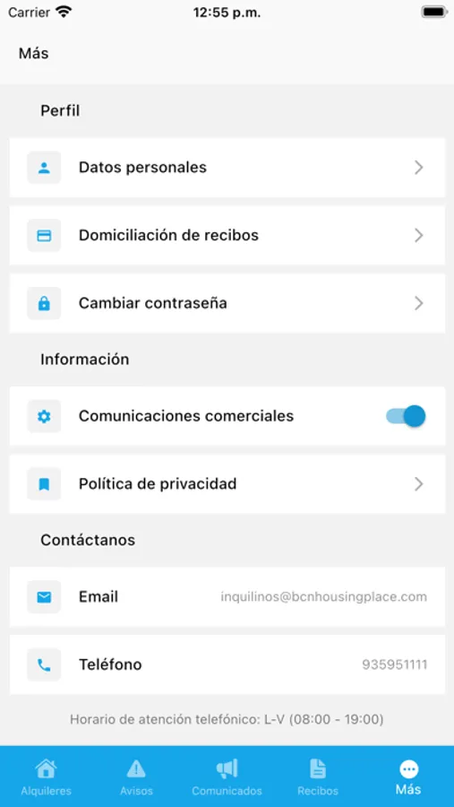 Muévete por los submenús: Alquileres, Avisos, Comunicados, Recibos y Más…