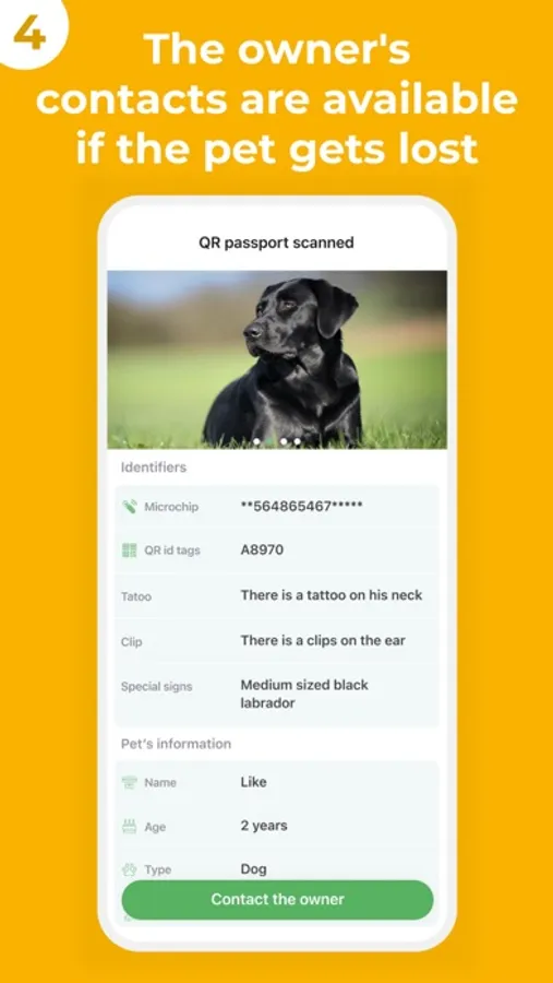 The pet's public profile contains the owner's contacts. The person who scanned the tag will be able to choose a way to quickly contact you.