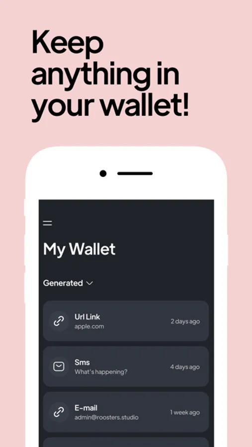 QR code reader and barcode scanner help to create any QR code instantly in any format: URL Link, Text, Clipboard Text, Phone number, E-mail, SMS, Wifi, and more. When you fill in inputs and tap Generate button, you can create your own QR code and keep it in your wallet.