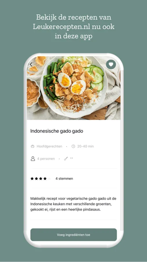 Met deze gratis app heb je toegang tot meer dan 2000 lekkere en makkelijke recepten van LeukeRecepten.nl. Van ovenschotels, makkelijke pasta's, gezonde salades, vega(n) recepten, hartige hapjes tot ontbijtjes en lekkere zoete baksels. Laat je inspireren, maak een account aan of log in met je bestaande LeukeRecepten gegevens en sla al je favoriete recepten op. Met deze app heb je niet altijd de leukste recepten bij de hand maar ook je boodschappenlijstje.