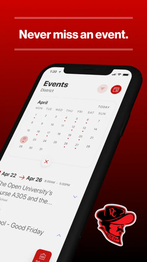 The event section shows a list of events throughout the district. Users can add an event to their calendar to share the event with friends and family with one tap.